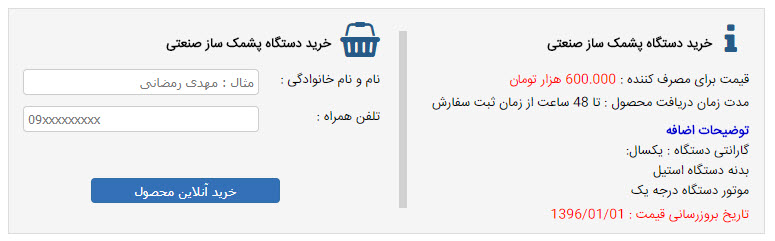 خرید آنلاین ساده ترین و بدون دردسر ترین سیستم جهت پرداخت هزینه دستگاه و ثبت سفارش بصورت آنی می باشد. تمامی ثبت سفارشات آنلاین در روز سفارش برای خریدار ارسال میگردند و زمان تحویل کالا برای مشتری حداکثر تا 48 ساعت از زمان ارسال برای مشتری ضمانت گردیده است. جهت خرید آنلاین ، فرم خرید همانند تصویر زیر در انتهای توضیحات دستگاه تعبیه گردیده است و شما میتوانید با پرکردن فرم اقدام به ثبت سفارش محصول بصورت آنلاین نمایید.